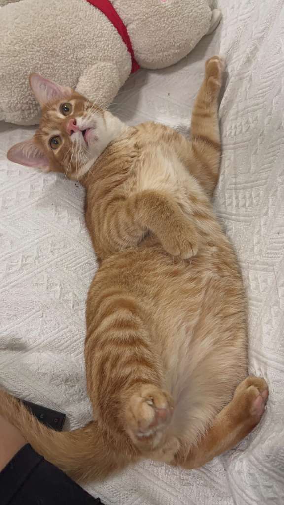 Mort is a damn cute male kitten with wonky sad eye who ws found with his sister (Maurice). He enjoys his food (please see his pear shape backside) and attention from people – always running around them asking for the sayangs. Head scritches and bum bum pats accepted. Always