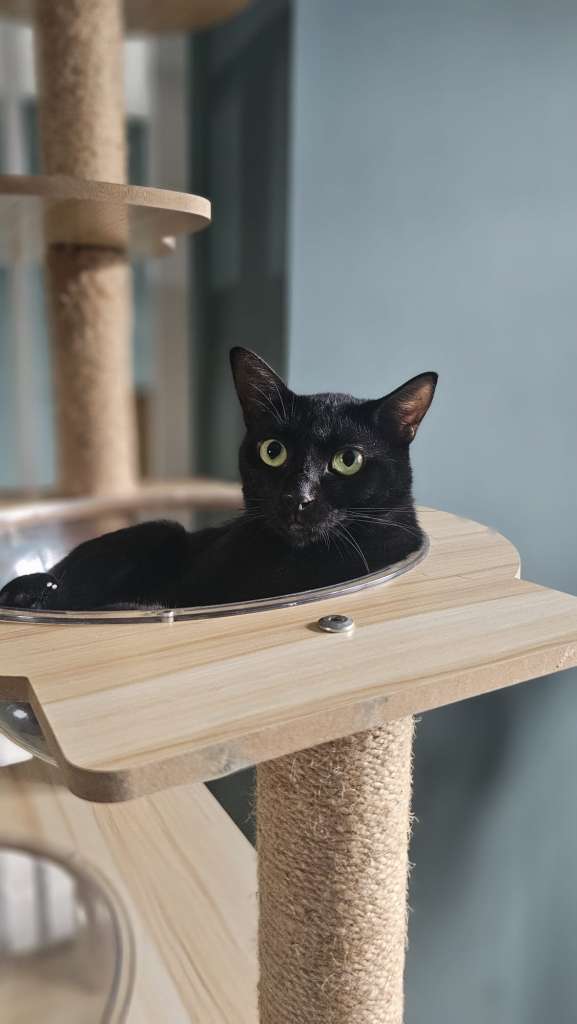 Wednesday came to me as a wee kitten with her brother Pugsley. Pugsley was adopted but Wednesday developed FIP and required treatment. She has successfully completed her treatment and is a nice round chonker these days with a beautiful long tail. She loves butt scritches like, LOVES butt scritches. She also seriously loves those round plastic bowl things. I think she identifies as a circle.